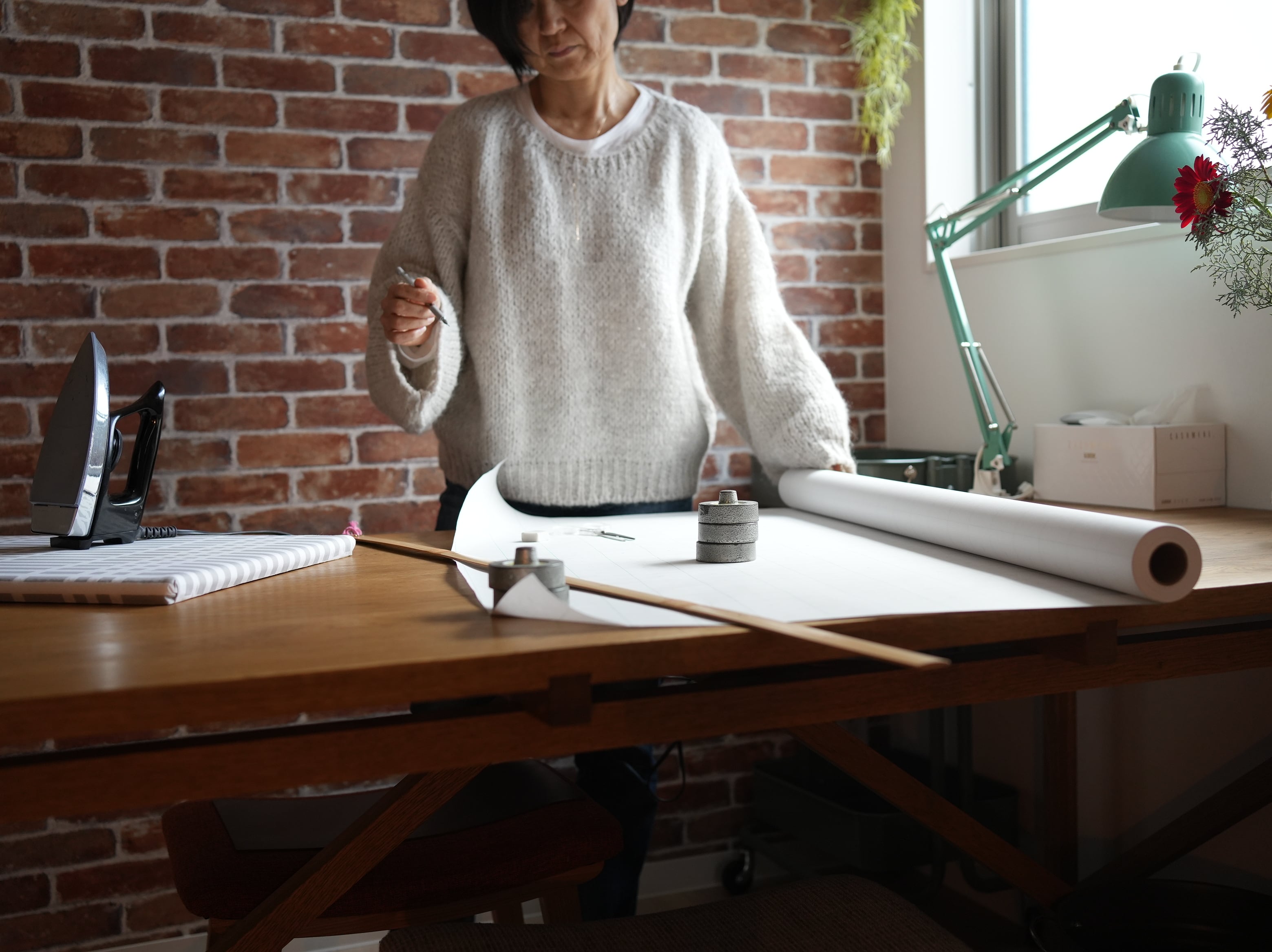 一着分ずつ反物を広げ、型紙を置いての裁断から始め。縫製、ボタン付けまでをひとりの担当でお仕立てしています。
