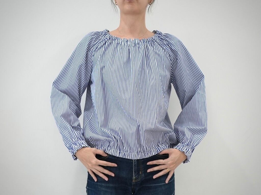 ブルー×ホワイトの爽やかな長袖ブラウスです。