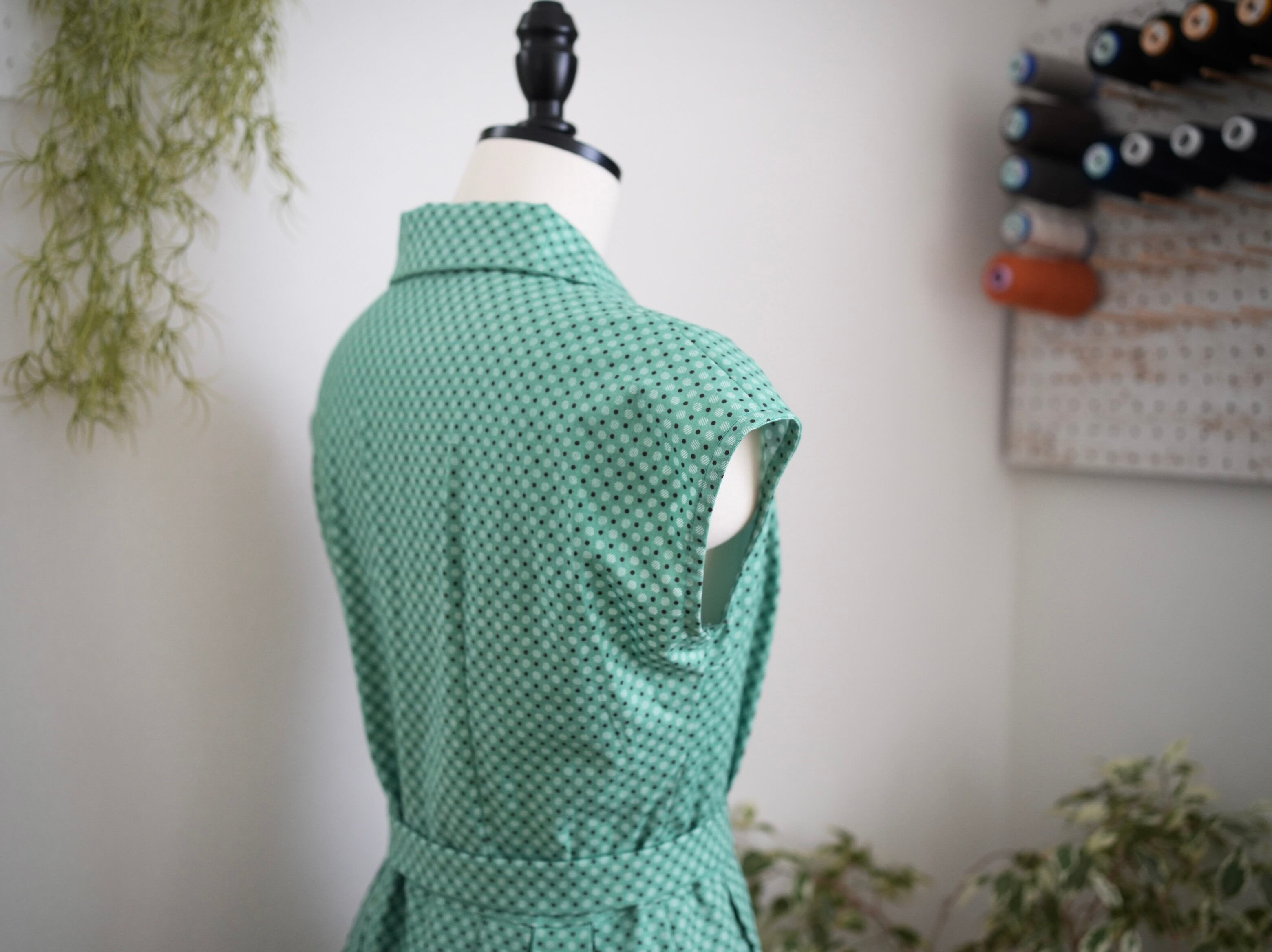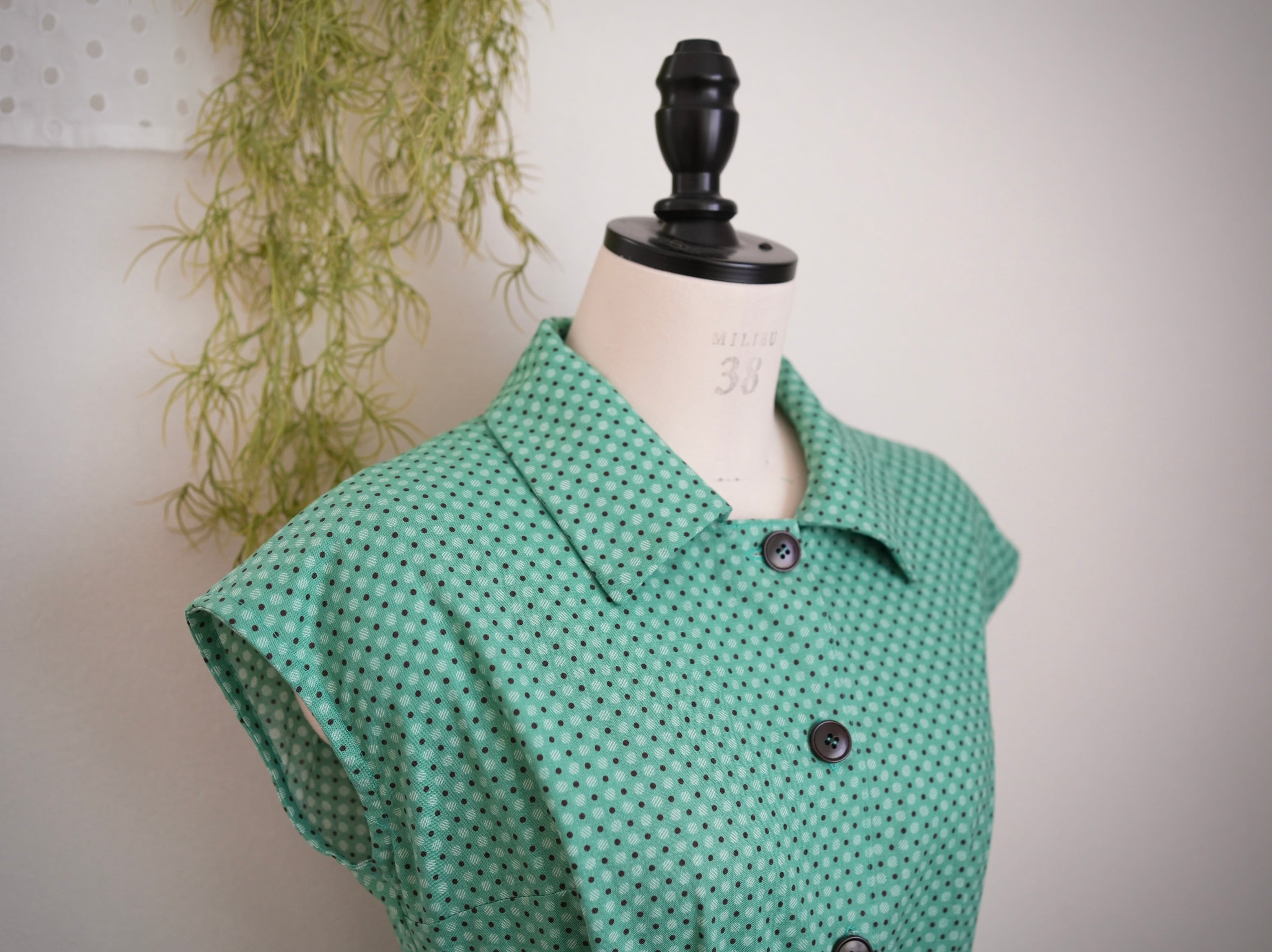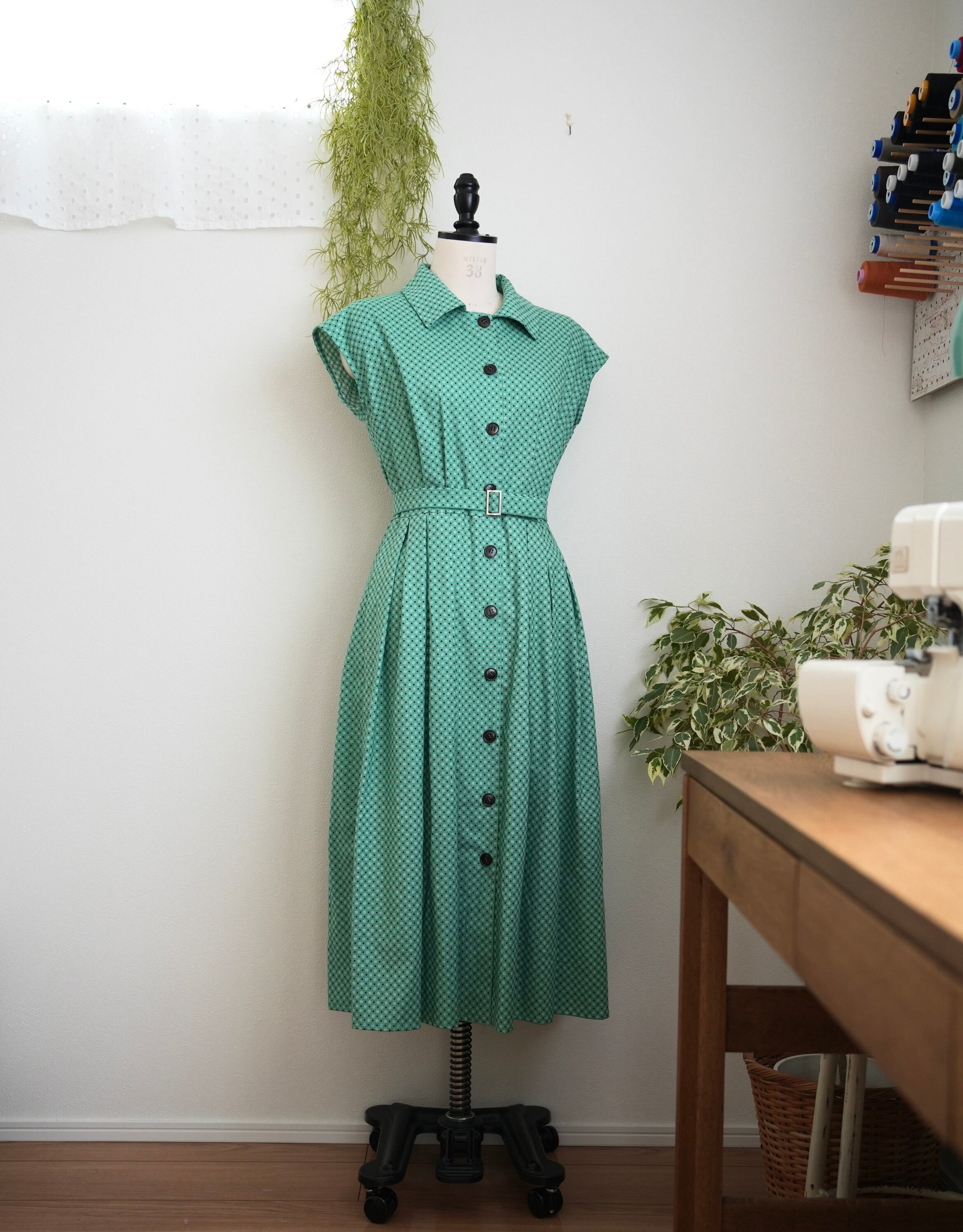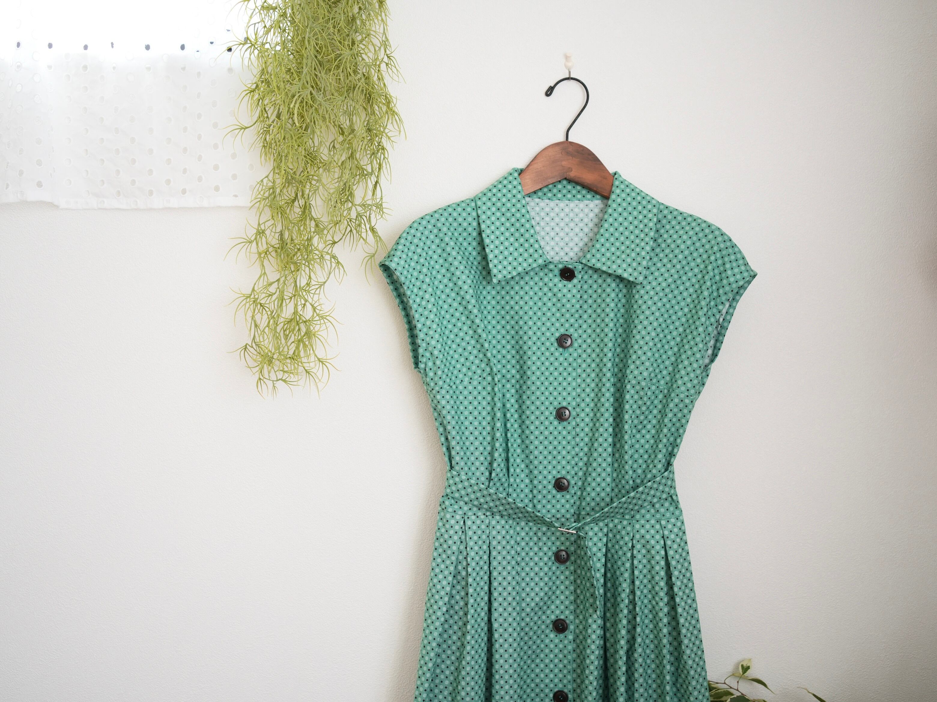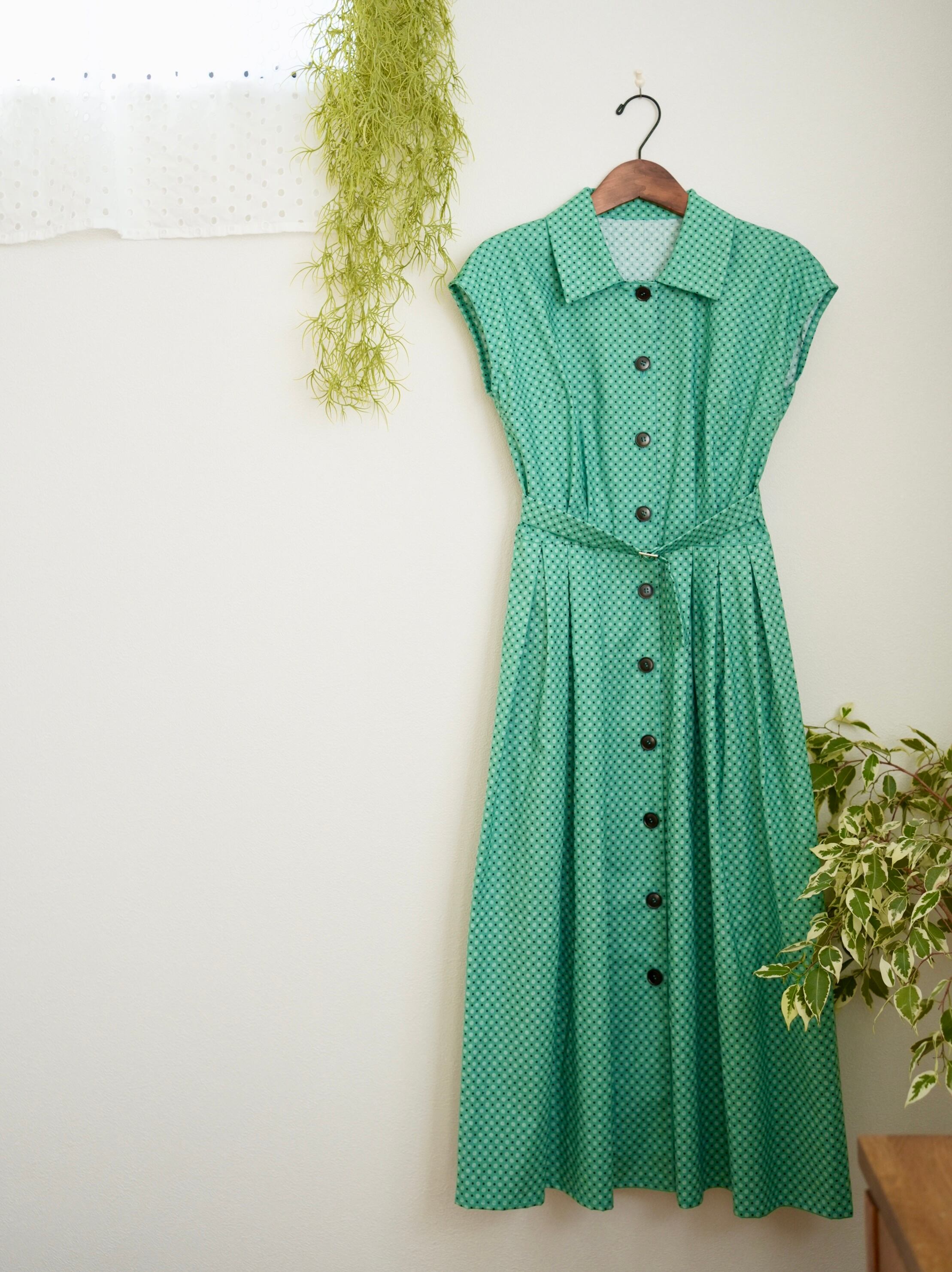 1960年代風 フレンチスリーブワンピ|グリーン柄・ウエストベルト付き